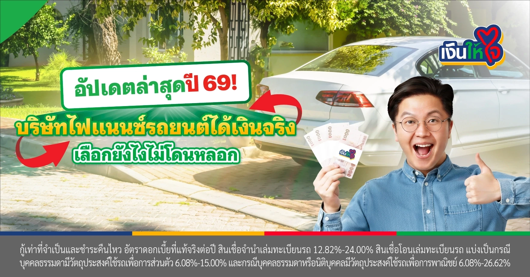 “กู้เท่าที่จำเป็นและชำระคืนไหว อัตราดอกเบี้ยที่แท้จริงต่อปี สินเชื่อจำนำเล่มทะเบียนรถ 12.82% - 24.00% สินเชื่อโอนเล่มทะเบียนรถ แบ่งเป็นกรณีบุคคลธรรมดามีวัตถุประสงค์ใช้รถเพื่อการส่วนตัว 6.08% - 15.00% และกรณีบุคคลธรรมดาหรือนิติบุคคลมีวัตถุประสงค์ใช้รถเพื่อการพาณิชย์ 6.08% - 26.62%”