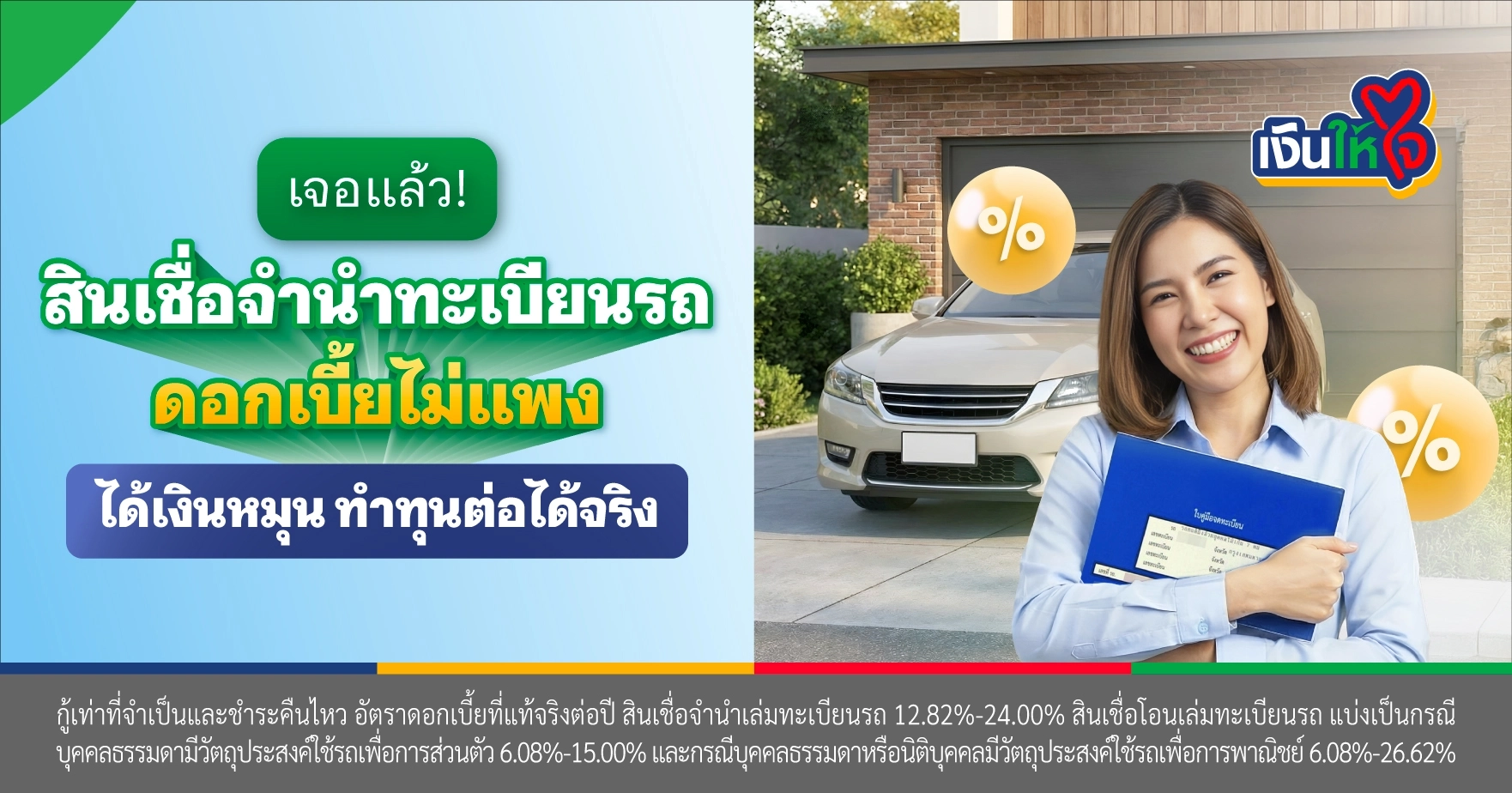 มองหาสินเชื่อจำนำทะเบียนรถ ดอกเบี้ยไม่แพง ต้องนึกถึงรถแลกเงิน สินเชื่อจำนำเล่มทะเบียนรถ เงินให้ใจ อาชีพไหนก็สมัครได้ ไม่ใช้ต้องเอกสารเยอะ ผ่อนชำระได้นานสูงสุด 72 งวด และมั่นใจในความปลอดภัยเพราะเงินให้ใจเป็นบริษัทที่อยู่ภายใต้การกำกับของธนาคารแห่งประเทศไทย