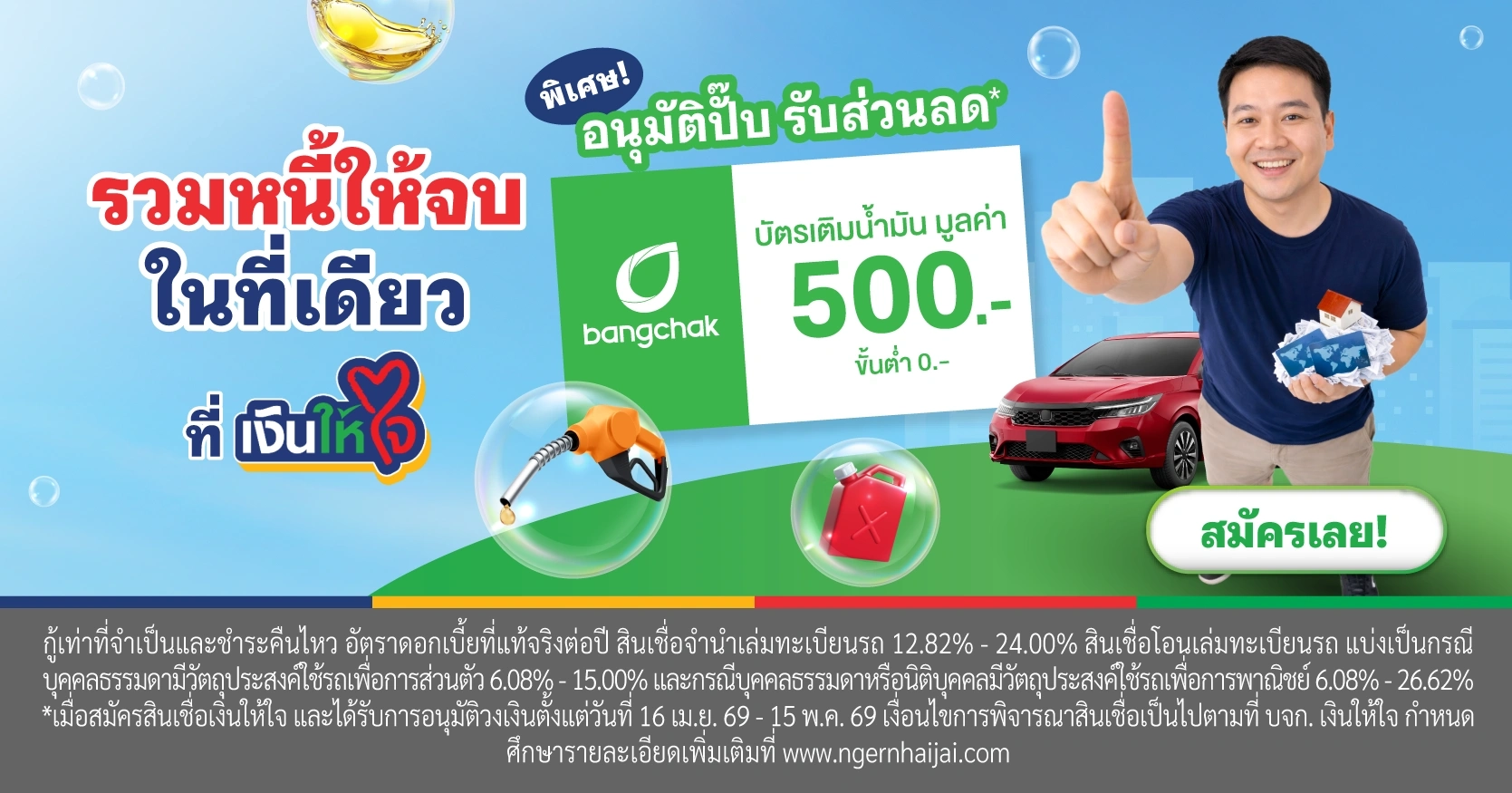 สมัครสินเชื่อรถแลกเงิน กับเงินให้ใจ ประเภทจำนำเล่มทะเบียนรถ รับส่วนลดเติมน้ำมันปั๊มบางจาก มูลค่า 500 บาท