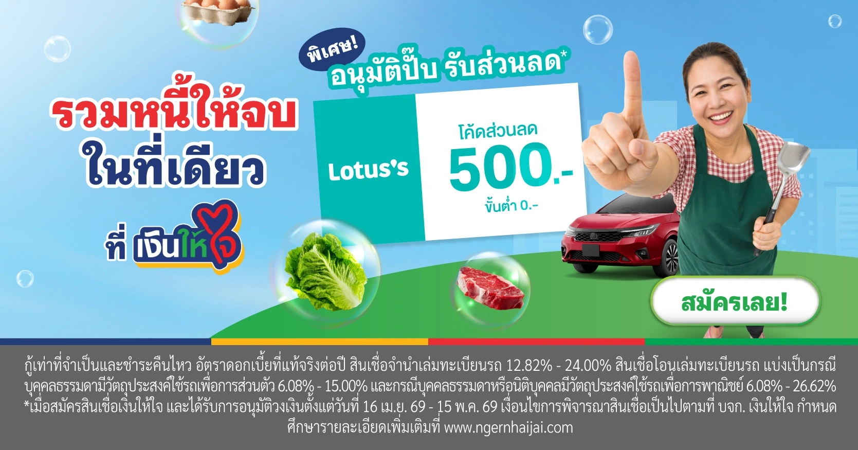 Campaign สมัคร เงินให้ใจ สินเชื่อรถแลกเงิน ประเภทจำนำเล่มทะเบียนรถ รับ e-Voucher Lotus’s มูลค่า 500 บาท